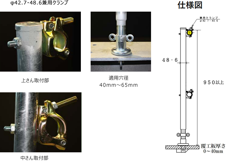 覆工板の吊り穴を利用して設置する手摺柱です